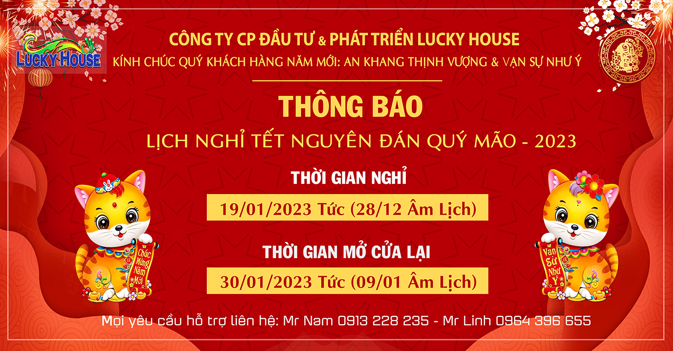 Lucky House xin trân trọng thông báo lịch nghỉ tết Nguyên Đán – Quý Mão 2023 Thời gian nghỉ: 19/01/2023 tức ngày (28 tháng chạp âm lịch) Thời gian hoạt động trở lại: 30/01/2023 tức ngày (09 tháng giêng âm lịch) Xin kính chúc Quý khách hàng, đối tác và gia đình năm mới